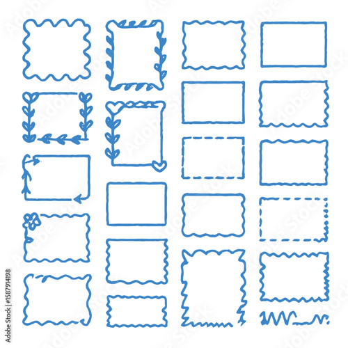 Collection of hand-drawn blue decorative frames, various shapes and styles, blank for text or images.