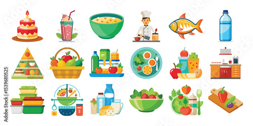 healthy, food, icon, kitchen, utensil, nourishment, diet, fruit, vegetable, salad, fish, water, milk, cheese, yogurt, cake, smoothie, soup, pyramid, cooking, white, background, illustration, vector, flat, design, graphic, isolated, clip art, element, lifestyle, balanced, meal, preparation