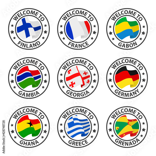 flag, stamp, finland, france, gabon, gambia, georgia, german, ghana, greece, grenada, vector, travel, custom, business, logotype, design, icon, pattern, vintage, star, banner, welcome, signs, seal, symbol, label, illustration, product, tour tourism, emblem, holiday maker, guarantee, sticker, national, badge, state, tags, graphic, star, insignia, buttons, original, print, circle, country, state, visa, vouchers