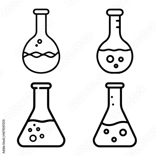 Collection of Laboratory Flask Icons – Black and White Line Art of Science Beakers, Chemistry Test Tubes, and Experimental Glassware Symbols for Education, Research, and Scientific Design