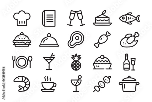 Collection of Minimalist Food and Drink Icons for Restaurant Menu Design and Culinary Arts Projects Featuring Chef Hat Menu and Beverage Elements