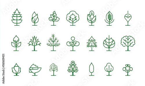 Collection of minimalist green line art tree icons.
