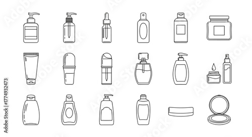 Collection of minimalistic thin outline icons representing various cosmetic bottles and containers, perfect for web design, graphic design, apps, banners, social networks, and cards. This vector