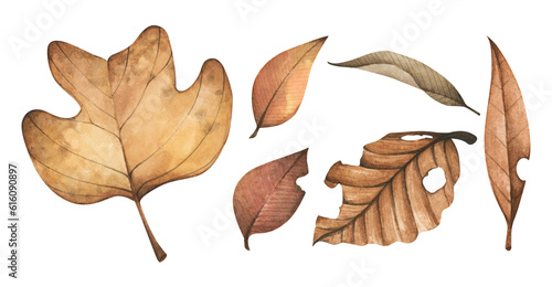 Collection of multicolored fallen autumn leaves. Isolated on white background. Watercolor illustration.