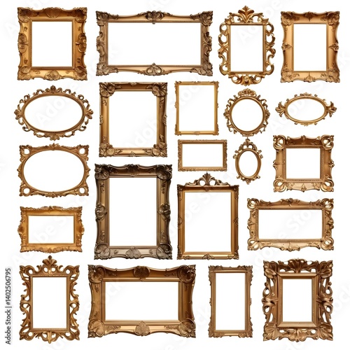 picture frame, frame, gold, ornate, antique, vintage, baroque, rococo, gilded, collection, set, isolated, white background, design element, decoration, gallery