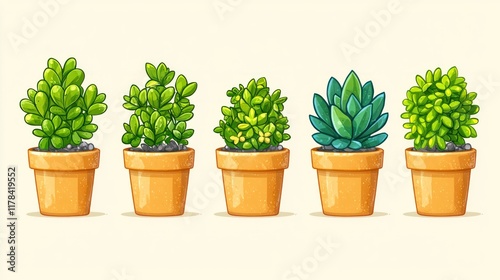 Collection of potted plants, illustration of five different types of houseplants in terracotta pots, growing plants, home decoration, green plants, succulents, foliage