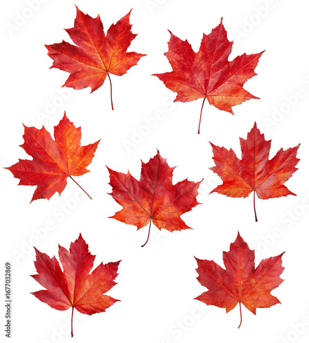 Collection of red maple leaves on a white background, autumn maple leaves with red and yellow gradients, PNG