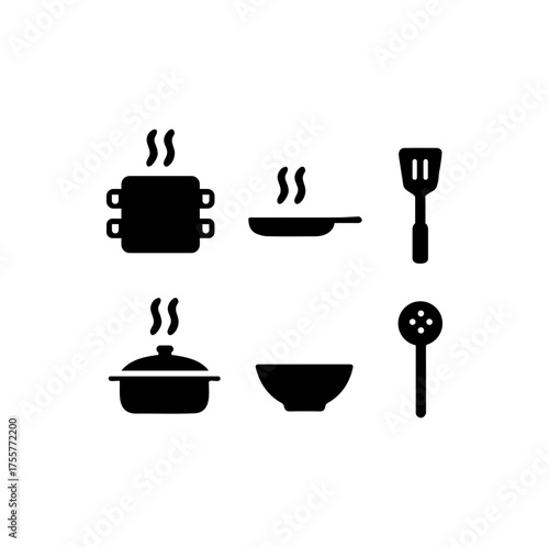 vector, illustration, scalable, icon, cooking, kitchen, utensil, pot, pan, bowl, food, cookery, chef, gastronomy, steam, hot, meal, preparation, culinary, drawing, graphic, design, element, clip art, silhouette, appliance, equipment, set, collection