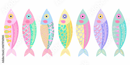 fish, illustration, vector, art, design, colourful, pattern, decorative, cute, whimsical, stylised, drawing, graphic, sea, ocean, aquatic, marin, animal, creature, hand-drawn, painted, abstract, geometric, striped, dotted, scaled, pink, blue, yellow, purple, teal, pastel, bright, vibrant, childish, children, baby, childcare center, decoration, motif, seamless, background, isolated, white background, set, group