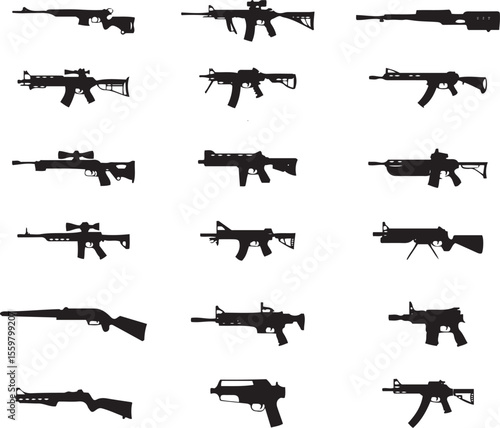 weapon, assault rifle, firearm, weapon, rifle, set, gun, military, army, gun, handgun, isolated, firepower, white background, munition, revolver, machine gun, sharpshooter, black, war, defense, shooting, target, fire, trigger, handgun, shotgun, silhouette, weaponry, machine, vector, precision, battle, illustration