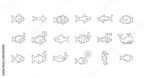 Collection of simple line art icons featuring various sea creatures including fish, sharks, and a seahorse, isolated on a