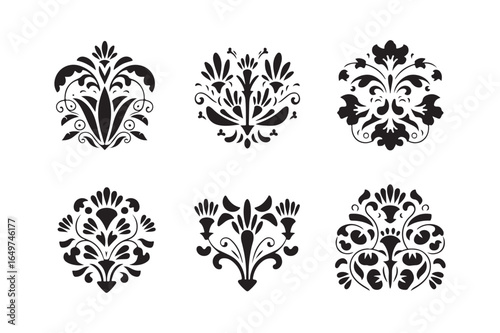 floral, ornate, decorative, embellishment, motif, design, pattern, illustration, vintage, antique, traditional, filigree, scrollwork, damask, baroque, rococo, ornament, swirl, leaf, flower, symmetric, black, and, white, graphic, vector, clip art, silhouette, stylised, elegant
