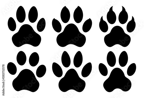 Collection of Six Different Black Paw Prints on White Background Dog Cat Bear Wild Animal Tracks