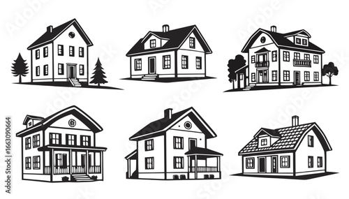house, home, building, residential, architecture, illustration, vector, design, property, real estate, dwelling, residence, exterior, traditional, modern, suburban, urban, bungalow, luxury home, neighbourhood, street, icon, symbol, graphic, art, drawing, vignetting, outline, silhouette, black-and-white, monochrome, simple, clean, isolated, set, collection, various, different, style, vintage, classic, roof, window, door