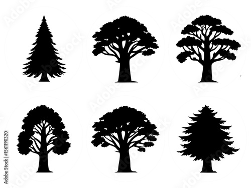 tree, silhouette, oval, black-and-white, nature, plant, deciduous, evergreen, conifer, forest, timberland, botany, growth, organic, design element, icon, graphic, vector, isolated, pattern, set, collection, leaf, tree branch, trunk, foliage, botanical, landscape, seasonal, simple, clean, minimalist, art, illustration