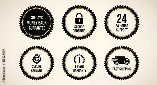 Collection of six vintage style business guarantee and service icons