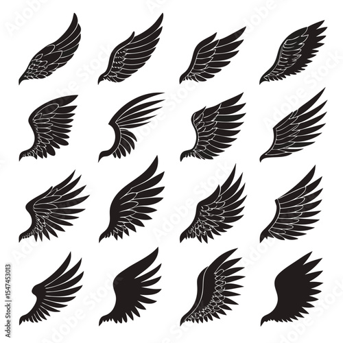 Collection of Sixteen Black and White Wing Illustrations for Design and Decoration Purposes