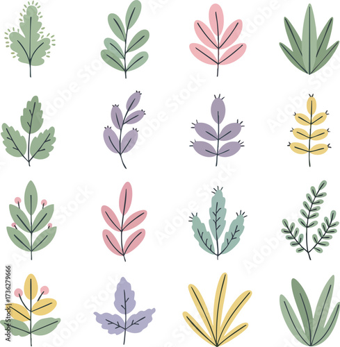leaf, leaf, foliage, botanical, botany, nature, plant, flora, floral, design, element, illustration, graphic, vector, pattern, decorative, decoration, ornament, artistic, drawing, vignetting, style, stylised, pastel, colours, colourful, vibrant, bright, light, green, pink, purple, yellow, blue, teal, mint, spring, summer, autumn, fall, season, seasonal, isolated, background, white, simple, clean, modern, contemporary
