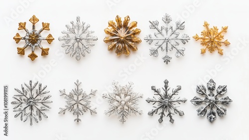 snowflake, snowflake, set, collection, isolated, snow, white, white background, background, cold, winter, metal, silver, metallic, christmas, decoration, decor, decorative, christmas, ice, holiday, pattern, design, flake, ornament, crystal, symbol, glacé, star, celebration, new year, flake, nature, gold, gold, frost, year, new