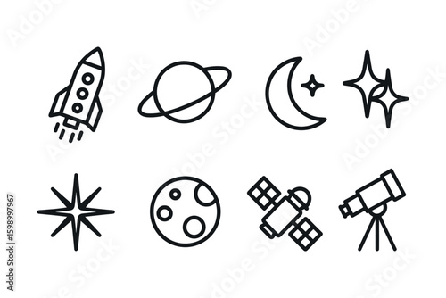 space, icon, rocket, moon, telescope, planet, star, satellite, astronomy, celestial, cosmos, line, simple, minimal, galaxy, explore, universe, doodle, outline, orbit, solar, system, science, discovery, adventure, research, exploration, cosmic, astrophysics