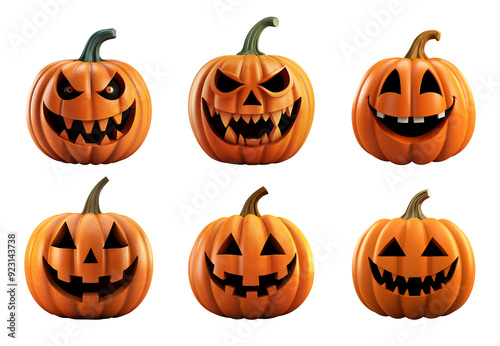 Collection of spooky jack-o'-lantern pumpkins with various carved faces for Halloween