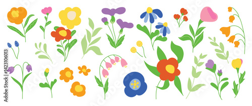 Collection of spring colorful flower elements vector. Set floral of wildflower, leaf branch, foliage on white background. Hand drawn blossom illustration for decor, easter, thanksgiving, clipart.