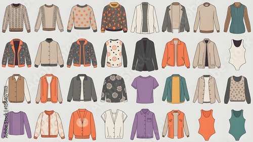 clothing, fashion, apparel, garment, style, clothes rack, outfit, collection, set, illustration, drawing, vector, design, fashionable, modern, casual attire, formal, outerwear, top, sweater, jacket, shirt, cardigan, bomber jacket, blazer, t-shirt, sleeveless, pattern, print, white background