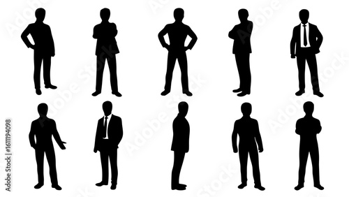 silhouette, figure, pose, vector, black, white, standing, man, person, suit, attaching, arms crossed, businessman, formal, professional, isolated, illustration, graphic, design, shape, outline, symbol, icon, artwork, clip art, drawing, human, male, adult, elegance, style, corporate, leadership, success, confidence, presentation, meeting, team, group, collection, set, various, uniform, gesture, posture, body, full body, figure, racked