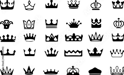Collection of thirty diverse black crown silhouettes on a white background representing royalty and power