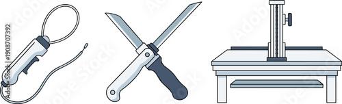 tool, illustration, equipment, white, background, vector, loop, wire, handle, cord, knife, folding, blade, metal, table, adjustable, height, mechanism, support, racked, object, set, collection, minimalist, clean, simple, graphic, design, icon