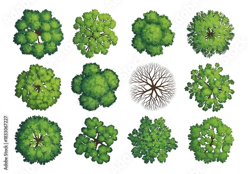 tree, top, view, plant, nature, green, leaf, foliage, canopy, round, shape, garden, park, forest, botany, botanical, growth, life, organic, pattern, design, element, set, collection, group