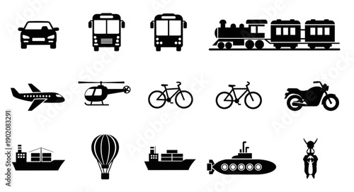 car, bus, train, aeroplane, helicopter, bicycle, motorcycle, ship, submarine, transport, vehicle, icon, silhouette, set, collection, graphic, design, illustration, symbol, transportation, travel, journey, commute, mobility, movement, speed, engine, wheel, road, air, water, sky, sea, airliner, locomotive, automobile, cycle, bike, chopper, aeroplane, jet, liner, freighter, tanker, sub, boat, ferry, cargo