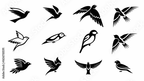 Collection of twelve black and white bird illustrations in various flying poses and wing positions design | editable eps vectors silhouette