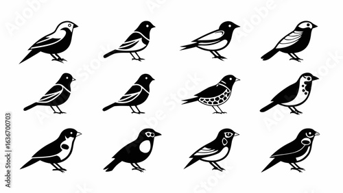 Collection of twelve stylized black and white bird silhouettes in various poses and plumage patterns | editable eps vectors