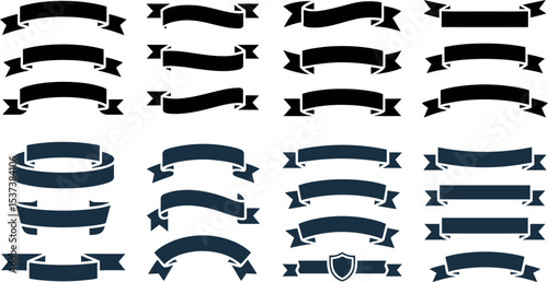 Collection of various black banner designs with different shapes and ribbon tail variations