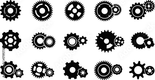 gear, cogwheel, mechanical, machinery, technology, industry, engineering, connection, teamwork, movement, power, system, mechanism, innovation, progress, abstract, silhouette, black, white, design, concept, industrial, interlocked, multiple, set, collection, engine, part, component, drive