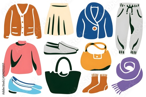 clothing, sweater, skirt, pant, accessory, cardigan, pursed, foulard, sock, shoe, fashion, casual clothes, pink sweater, modern style, collection, various, item, including