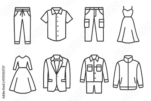 clothing, outline, pant, shirt, dress, jacket, fashion, apparel, minimal, style, clothes rack, casual attire, formal, attire, garment, male, female, unisex, short, t-shirt, blouse, gown, suit, fashionable, trendy, design, closet, garment, simplistic, icon, popular, lifestyle, graphic, textile, illustration, outerwear, pattern, fit, contemporary, choice, variety, selection, minimalistic, elegant