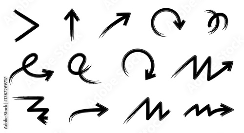 Collection of various hand-drawn black arrows pointing in different directions, isolated.