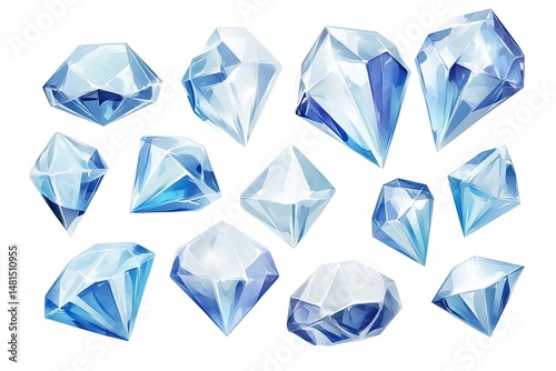 Collection of various light blue gemstones. Detailed illustration of different diamond shapes and facets, showcasing a range of light blue hues and sparkling reflections