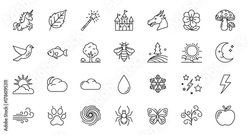 icon, vector, nature, fantasy, weather, minimalist, design, symbol, graphic, element, unicorn, leaf, wand, castle, dragon, flower, mushroom, bird, fish, tree, bee, hill, sun, moon, cloud