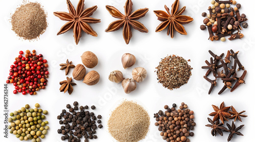 collection of various spices in white background