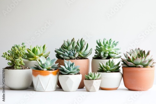 Collection of various succulents in decorative pots, arranged on a white surface against a plain background, creating a calming and minimalist aesthetic.