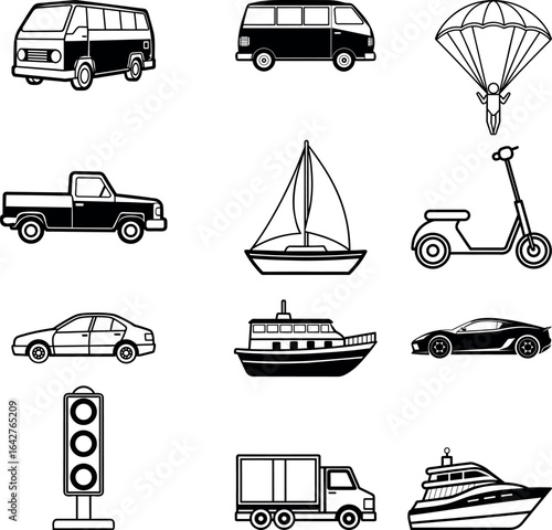 vehicle, transportation, icon, set, collection, illustration, drawing, vignetting, car, automobile, van, pickup, truck, lorry, boat, yacht, sailboat, scooter, motorcycle, traffic, light, parachute, air, land, sea, travel, mobility, graphic, design