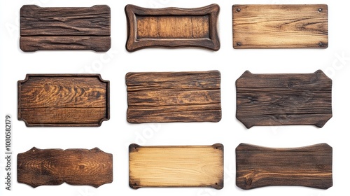 Collection of Various Wooden Signs in Different Shapes and Finishes on a White Background Perfect for Rustic Designs and Creative Projects
