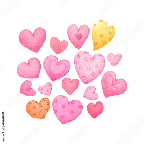 watercolor, heart, pattern, floral, collection, set, graphic, object, illustration, drawing, hand-painted, design, greeting, card, cute, lovely, baby, girl, romantic, nubes, love, valentine, pink, rose, isolated, red, white, shape, romance, decoration