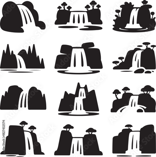 waterfall, water, nature, landscape, silhouette, icon, design, vector, illustration, graphic, cascade, stream, river, flow, mountain, rock, tree, forest, scenic, tour tourism, travel, environment, natural, symbol, element, shape, abstract, isolated, collection, drawing, artistic, flat, simple, clean, minimalist, set, black, white