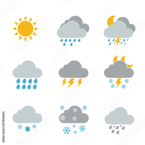 weather, icon, sun, sunny, cloud, cloudy, rain, raining, thunderstorm, lightning, storm, snow, snowing, snowflake, forecast, meteorology, climate, symbol, iconography, graphic, design, illustration, set, collection, bundle, information, datum, prediction, digital, art, vector, flat, style, clean, simple, modern, communication, nature, element, change, season, day, night, app