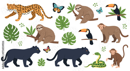 jaguar, leopard, panther, black panther, sloth, monkey, toucan, butterfly, snake, python, jungle, rainforest, forest, wildlife, animal, creature, mammal, bird, reptile, insect, tropical, exotic, nature, ecology, environment, habitat, biodiversity, conservation, safari, exploration, adventure, illustration, drawing, art, design, graphic, pattern, background, element, icon, set, collection, cute, cartoon