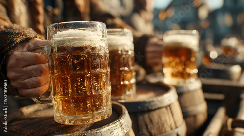 Collection of wooden barrels and glasses filled with beer